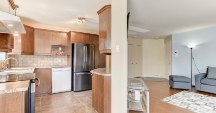 Condo en tr salon et la salle avec beaucoup d'armoires pour le rangement, grande chambre des ma dimension; salle de bains compl baignoire); salle de lavage s rangement; 2 espaces de stationnement et cabanon l'ext